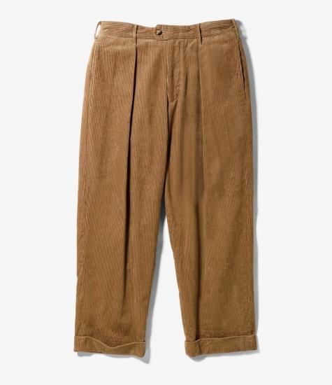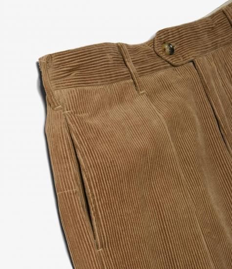 英国的なトラディショナルスタイルを彷彿とさせる、1インプリーツのシンプルなデザインのトラウザーズ。腰回りに適度なゆとりを持たせつつテーパードの効いたシルエットも特徴的です。8Wと通常より太めの畝のコーデュロイがカジュアルでデイリーユースな一着です。